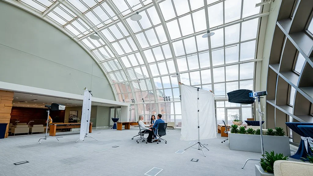 Even in stunning high-rise buildings with incredible views, some of the actual meeting spaces can feel visually flat. So we often repurpose larger, more architecturally compelling common areas — spaces with glass, light, wood paneling, and scale — and transform them into what feels like a high-level conference environment.